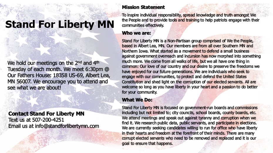It was that very governmental overreach and destruction of small business in America that laid the foundation for Stand For Liberty MN. We couldn’t sit back and watch ELECTED SERVANTS make unilateral decisions about who was allowed to make a living and who was not.